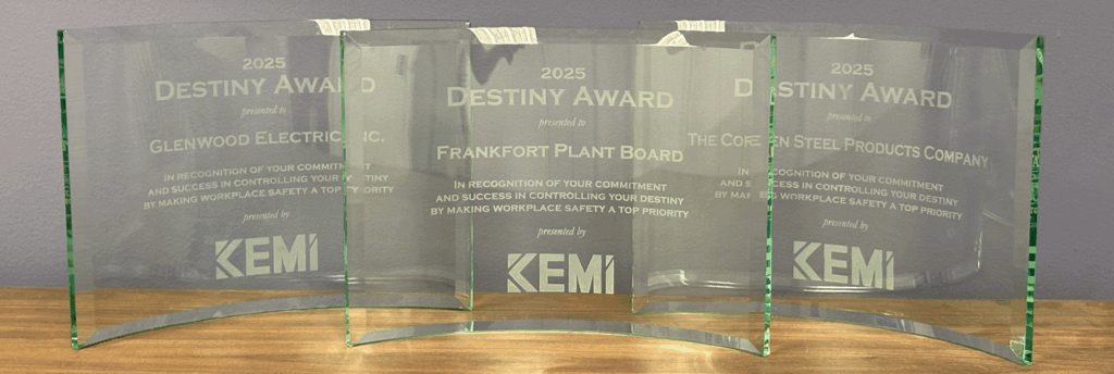 The Destiny Awards are presented annually by KEMI to policyholders best exemplifying KEMI’s motto, “Control your own destiny.” The awards symbolize what can be accomplished when organizations work together to improve workplace safety. Policyholders earning the KEMI Destiny Award effectively demonstrate to KEMI their ability to manage a formal safety program, provide on-site training and regular safety meetings for employees, and display an ongoing commitment to safety from all levels throughout their organizations.